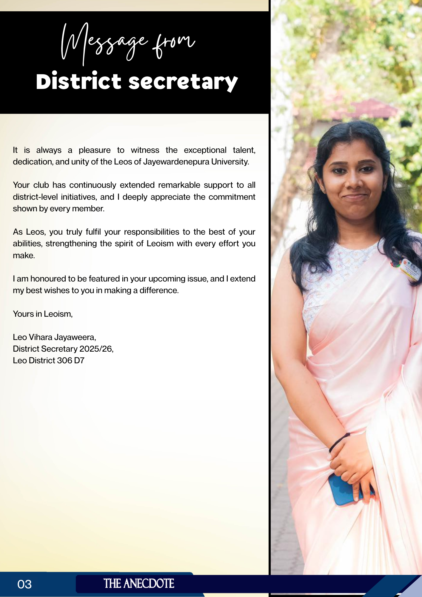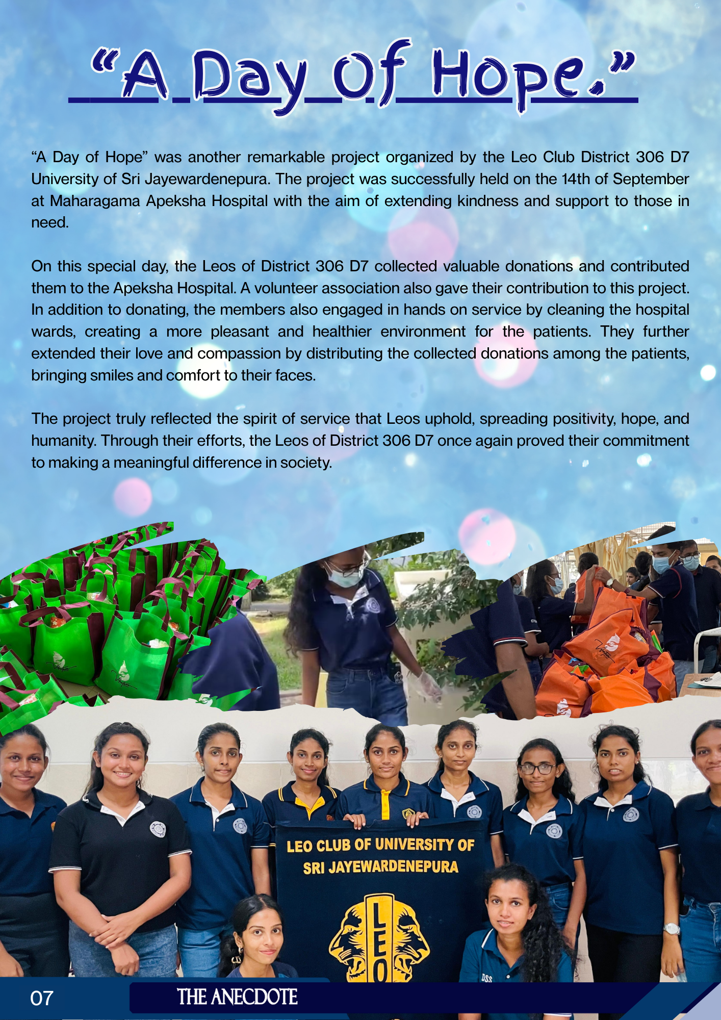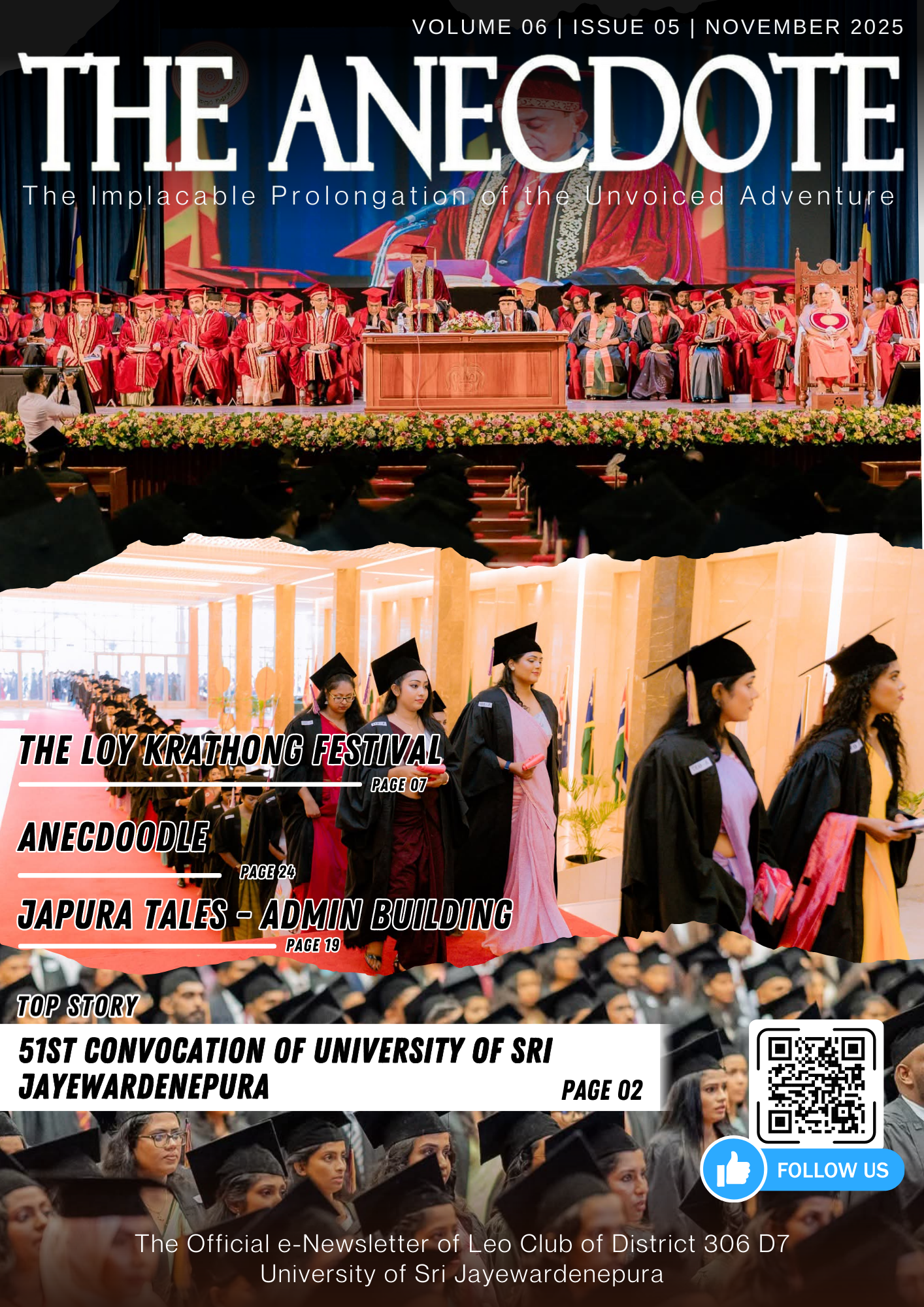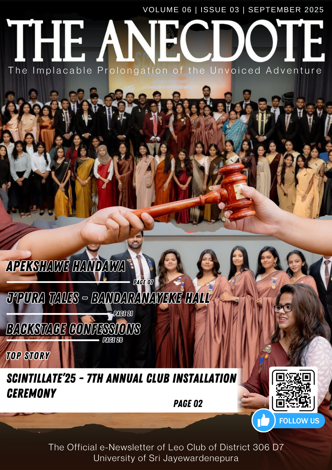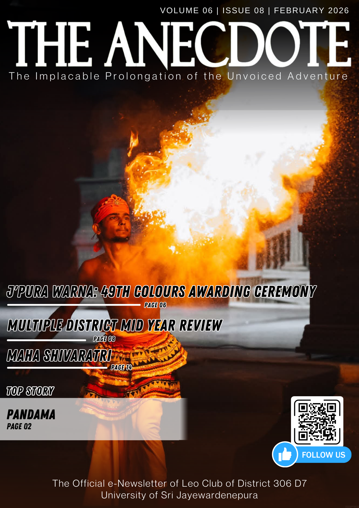 We are quite proud to present "THE ANECDOTE", the official e-newsletter of the Leo Club of District 306 D7 University of Sri Jayewardenepura. Get ready to embark on a fresh journey with our latest newsletter.