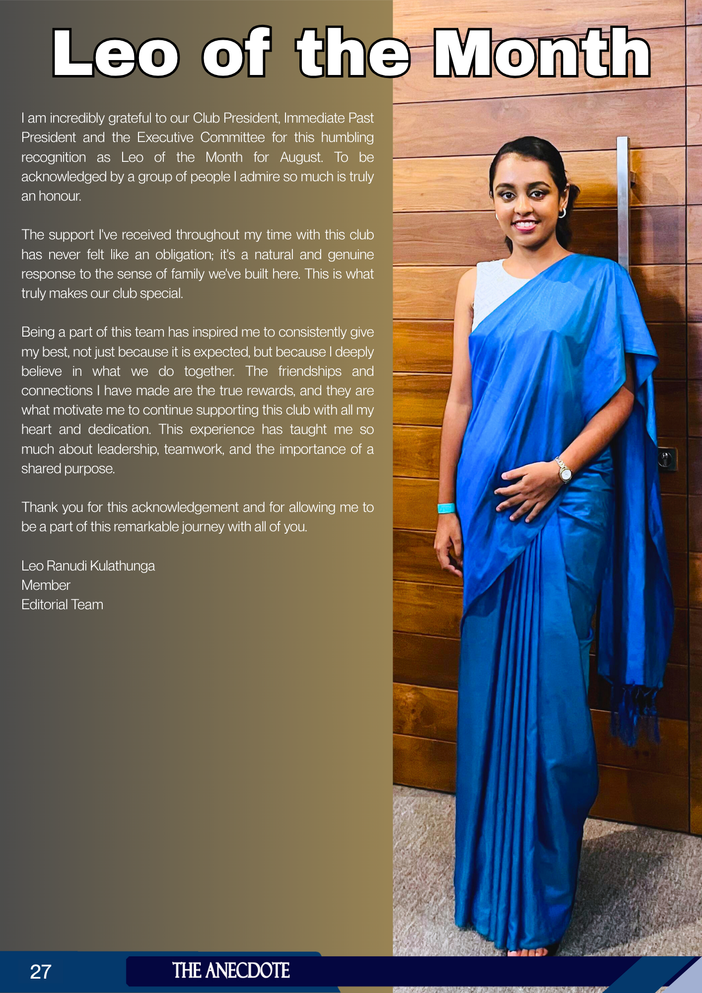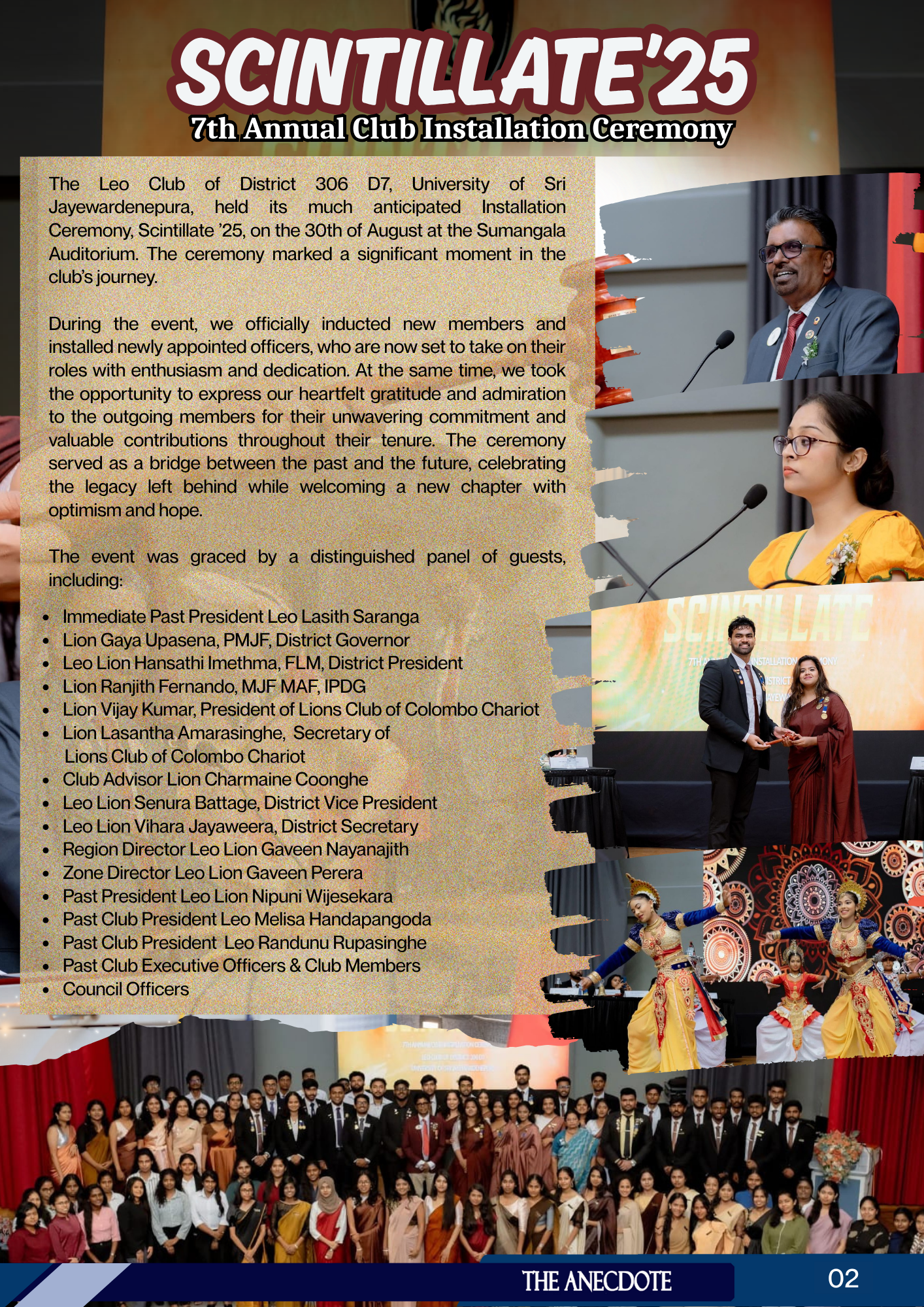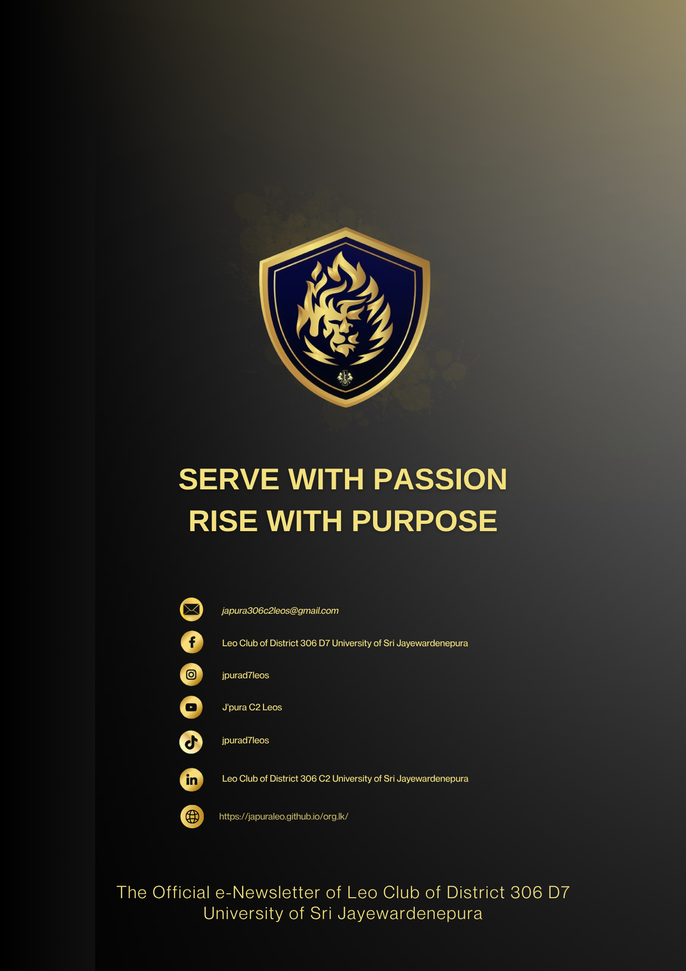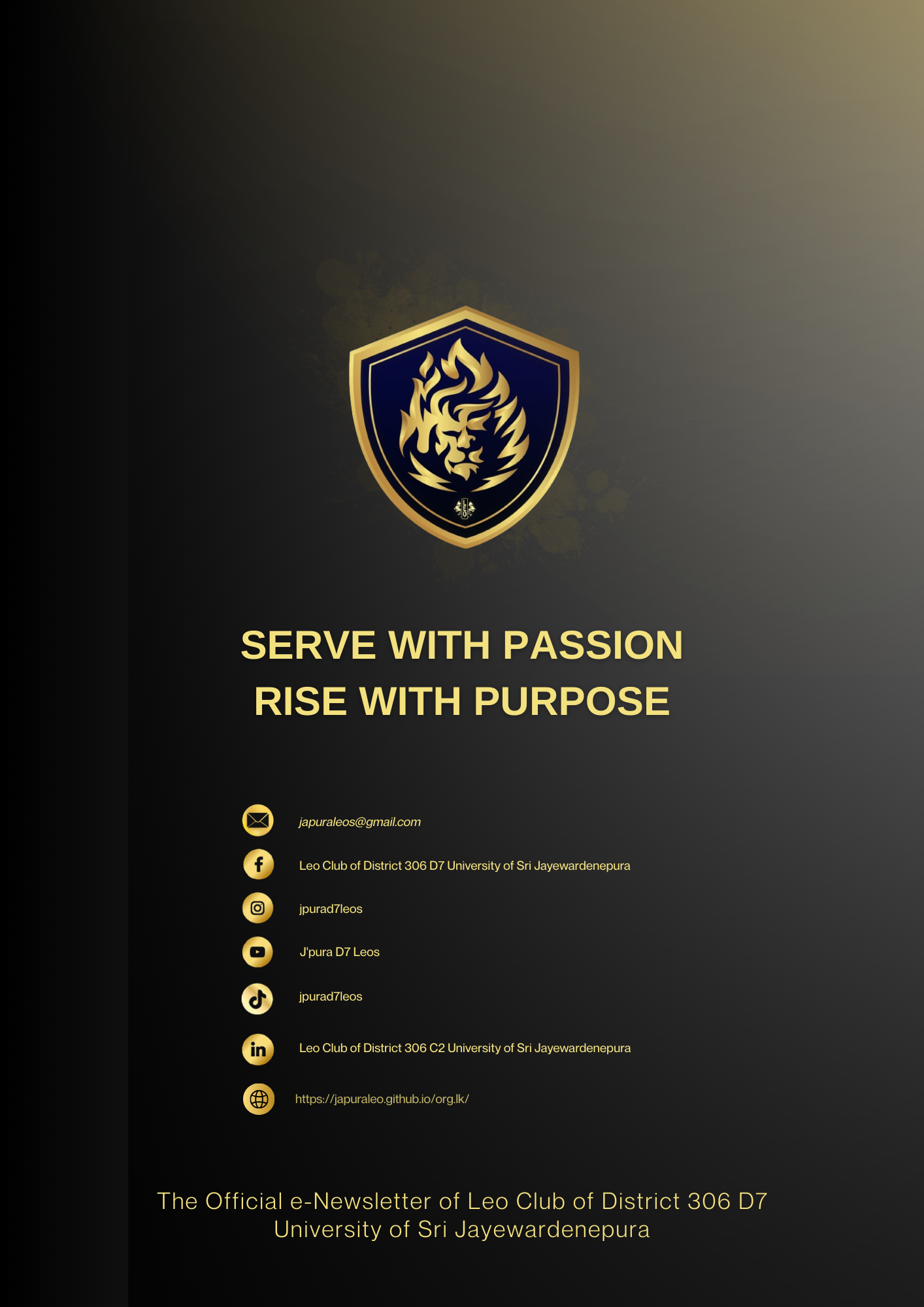 We are quite proud to present "THE ANECDOTE", the official e-newsletter of the Leo Club of District 306 D7 University of Sri Jayewardenepura. Get ready to embark on a fresh journey with our latest newsletter.