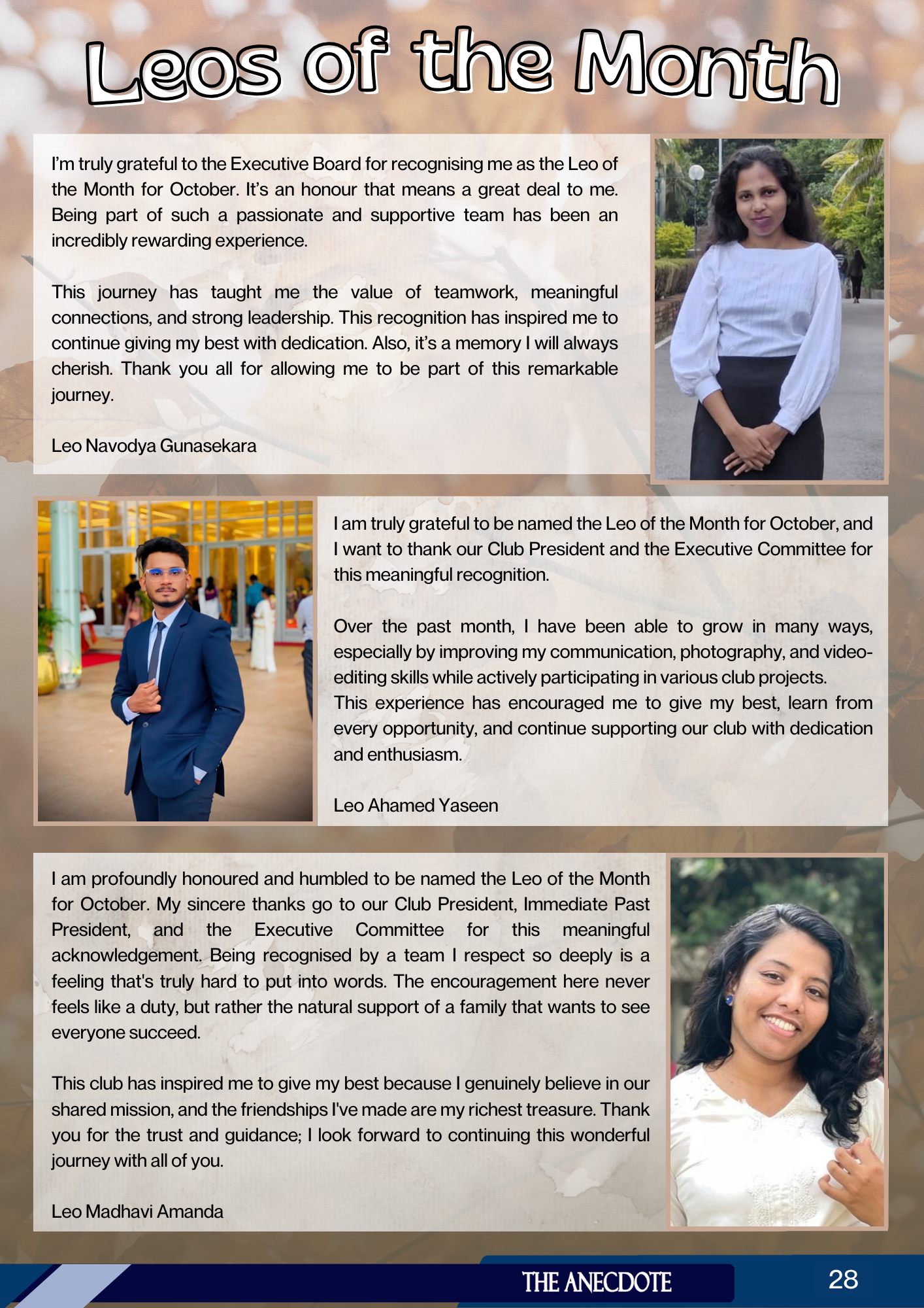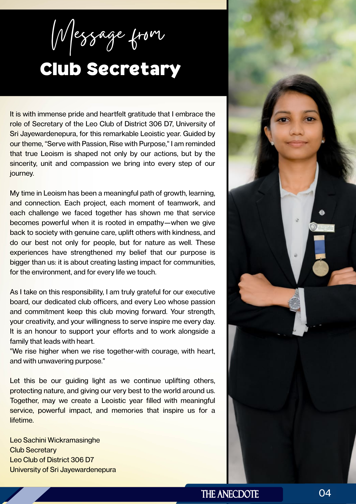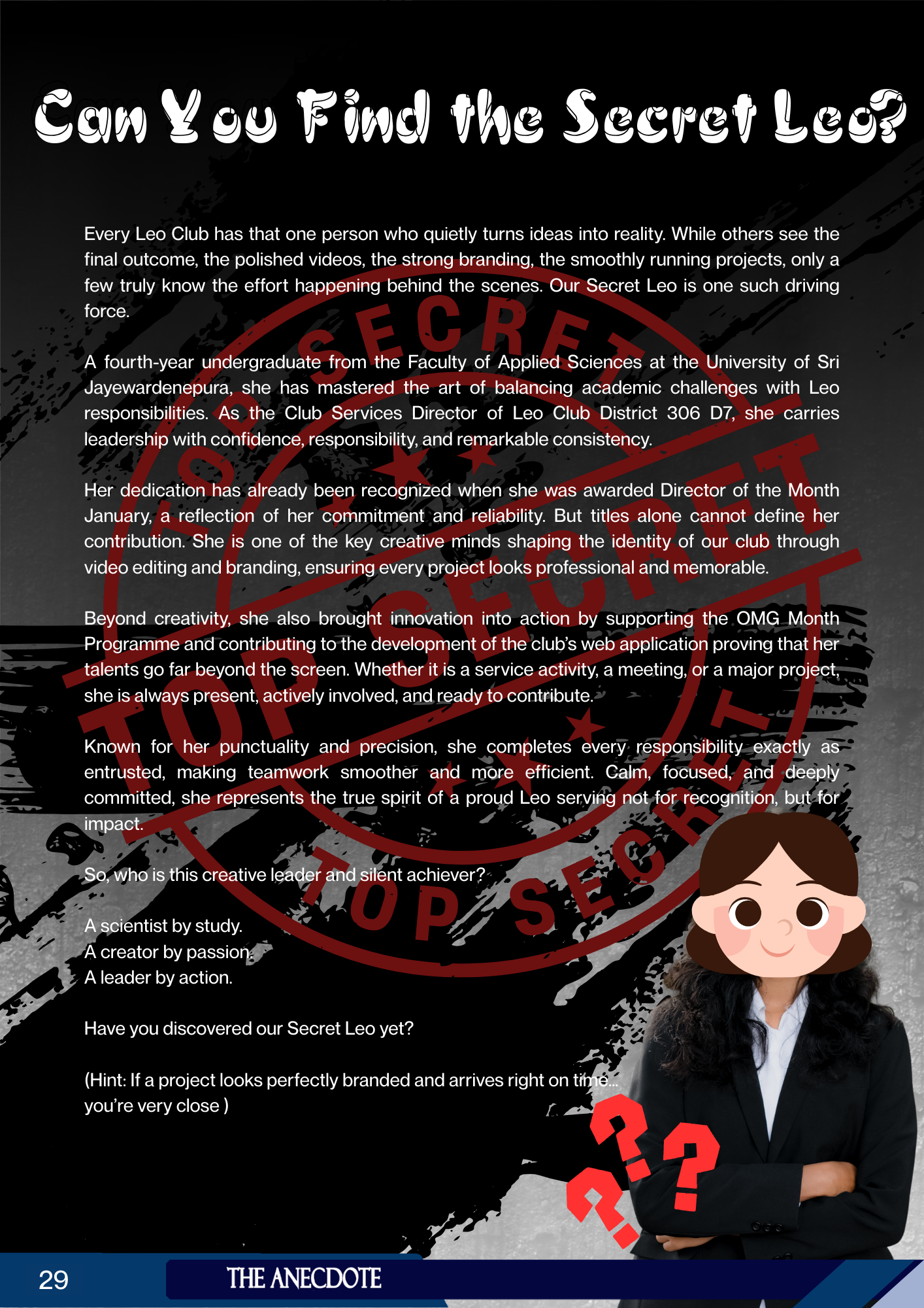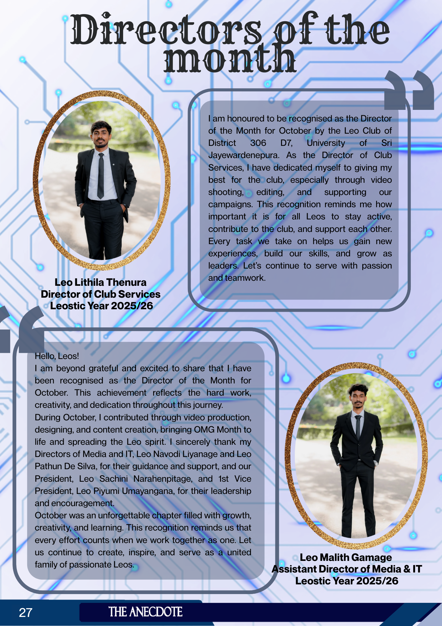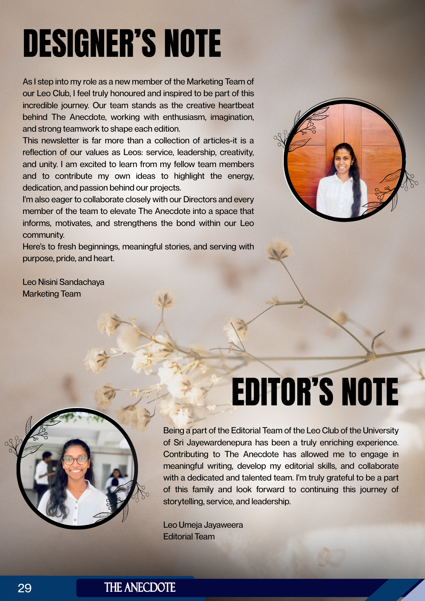 We are quite proud to present "THE ANECDOTE", the official e-newsletter of the Leo Club of District 306 D7 University of Sri Jayewardenepura. Get ready to embark on a fresh journey with our latest newsletter.